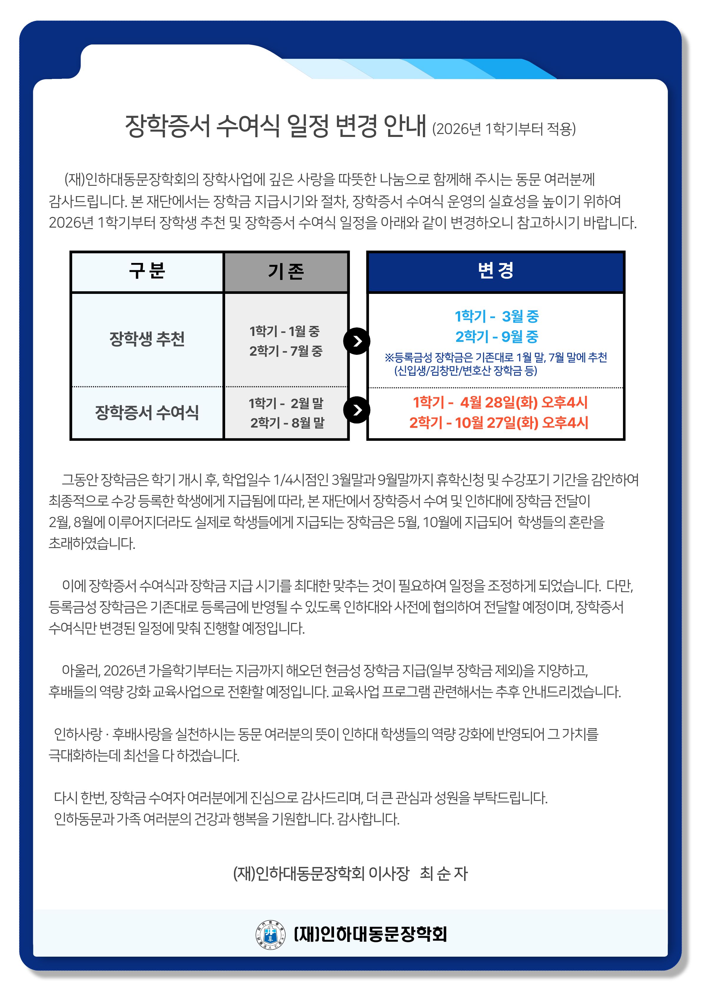 장학증서 수여식 일정 변경 안내(2026년 1학기부터 적용)